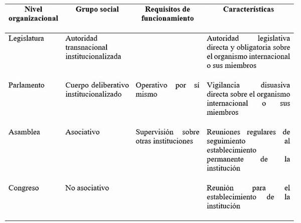 En contexto, Cutler (s/f) ofrece una definición de lo que son las instituciones parlamentarias internacionales, basándose en las categorías de sistemas presentes en los diversos estudios de Luhmann, y las describe como foros multilaterales regulares, de naturaleza consultiva o legislativa, que por sí mismas constituyen una organización internacional o que forman parte de un organismo internacional y en las cuales participan al menos tres unidades ‘transgubernamentales’ por intermedio de parlamentarios delegados quienes integran los parlamentos nacionales o que fueron elegidos por voto en los distintos Estados. Esta definición está fundamentada en la personalidad jurídica internacional de las instituciones y puede parecer restrictiva frente a los estudios que sobre las mismas instituciones desarrolló Claudia Kissling (2011), quien generó una clasificación a partir de mirar a las relaciones parlamentarias más allá del criterio de las instituciones intergubernamentales presente en el concepto de Cutler.
