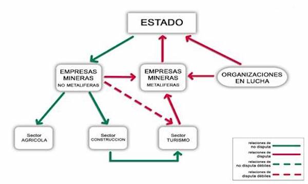 Mirar la red de relaciones de fuerza que al momento de decidir la dirección de la política minera (de permitir o prohibir la actividad minera, por ejemplo) se activan entre un grupo de actores, nos lleva a reconocer, entonces, que el resultado de la política es fruto del entrechoque de intereses y de acciones y no tanto de las definiciones semánticas que cargan, siempre remitido al marco de las relaciones que construyen y en las que participan.