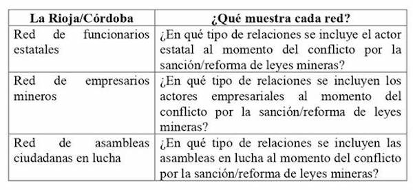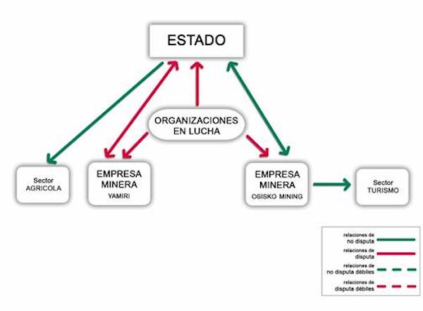 En la necesidad de operativizar esa dimensión de análisis, recurrimos a algunas herramientas operativas del enfoque de redes para considerar y graficar el tipo de relaciones que se establecen entre tres tipos de actores en cada una de las dos provincias estudiadas, con leyes distintas sobre la habilitación de la actividad minera: el Estado, las empresas mineras y las asambleas en lucha. Si bien de cada escenario de conflicto emergieron otros actores (universidades, medios de comunicación, sindicatos, etc.), nuestro estudio trabajó solo con estas tres categorías de actores, bajo el criterio de su centralidad, recurrencia y permanencia a lo largo del período analizado.