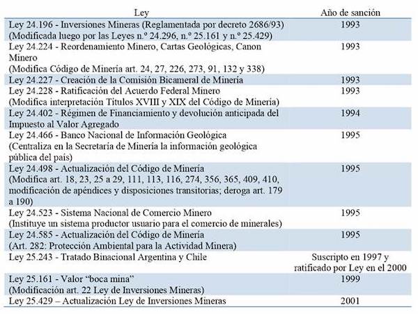 En Argentina, a escala federal, el paquete de leyes sancionadas durante la década de 1990 representa, junto al Código de Minería,6 el conjunto formalizado más importante de instituciones respecto a la actividad minera. Entrado el nuevo siglo, en un contexto global de fuertes incrementos de los precios de los metales y de extraordinarias ganancias empresariales, la legislación nacional casi no cambió la orientación de la década anterior, a pesar de sucederse medidas de mayor o menor carácter restrictivo para la actividad durante los primeros diez años de la década. Un detalle de esta normativa acompañada por el año de sanción se encuentra en la tabla que sigue a continuación: