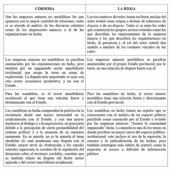 Es en el ejercicio comparado de los tres tipos de matrices de redes el momento en que se muestra cómo aparecen estas relaciones según el tipo de actor, y según el escenario provincial (en este artículo solo mostramos las matrices provinciales que corresponde al actor estatal). Es decir, la comparación integral de matrices según tipo de actor otorga claves importantes para comprender por qué, a pesar de compartir los tres sentidos del ambiente antes mencionados, en Córdoba rige una normativa que prohíbe la actividad minera metalífera a cielo abierto, y en La Rioja rige una normativa minera que la autoriza. Muy brevemente, los matrices de análisis en las dos provincias nos arrojaron ciertamente tipos de relaciones distintas en ambas provincias, dando cuenta de estructuras sociales y de poder diferenciales que, en cada caso, empujan en una dirección la decisión de prohibir o permitir la minería metalífera. Sistematizamos las principales distancias en la siguiente tabla: