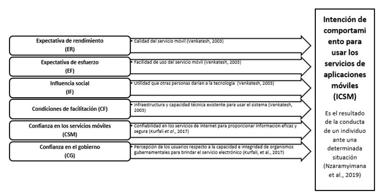 Para medir el nivel de aceptabilidad de las apps entre los 15 dirigentes barriales se acudió a la propuesta teórica de Kurfali et al. (2017) que, adaptando el modelo inicialmente propuesto por Venkatesh et al (2003) de 6 parámetros, obtiene la intención del comportamiento para usar servicios móviles (ICSM) como variable resultante (gráfico 1). Posteriormente se analizaron los resultados obtenidos a partir de técnicas no-paramétricas de análisis de datos (tablas de contingencia, análisis de frecuencia, coeficiente alfa de Cronbach y Cochran's Q test).