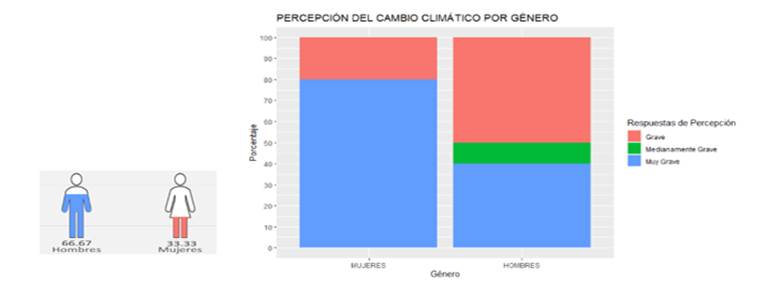 En relación a la percepción del cambio climático hay diferencias por género. El 80 % de las mujeres perciben que este problema es muy grave y el 20 % como un problema grave, mientras que, el 40 % de los hombres lo considera muy grave, el 50 % de grave y el 10 % como medianamente grave. Estos resultados son similares a resultados obtenidos en países europeos como España, por ejemplo, en los cuales las mujeres presentan un mayor nivel de preocupación en torno al cambio climático por el nivel de afectación al que están expuestas y, por ello, son actoras fundamentales para promover acciones sobre este problema (González, 2017).
