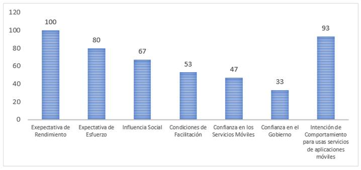 Las condiciones de facilitación (CF): obtiene una aceptabilidad media de 53% lo cual indica que los líderes perciben que la infraestructura tecnológica podría ser un limitante para desarrollar e implementar nuevos servicios en aplicaciones móviles. Este resultado es opuesto a los obtenidos en el Municipio de Loja, cuyos funcionarios aseguraron que existen “[…] las condiciones óptimas (al menos en la institución) para implementar la tecnología” (Cuesta, 2020, p.33).