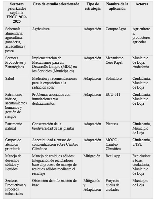 En la actualidad existe en Loja una gran variedad de apps que favorecen la adaptación, mitigación y resiliencia al cambio climático. De acuerdo a la ENCC se requiere de herramientas de innovación tecnológica que aporten en la reducción de las emisiones de GEI y sostenibilidad y propicien la adaptación en los sectores agrícolas, ecosistemas naturales, grupos humanos vulnerables, entre otros, para la mitigación en uso del suelo, energía, agricultura, manejo de desechos y procesos industriales (MAE, 2012). El estudio tuvo en cuenta ocho aplicaciones móviles cuyo criterio de selección era que tuvieran una relación directa con el cambio climático a partir de alguno de sus componentes (adaptación, mitigación y resiliencia) y que se relacionará con algunos de los sectores priorizados según la ENCC de Loja. Las aplicaciones escogidas siguen a continuación en la Tabla 1: