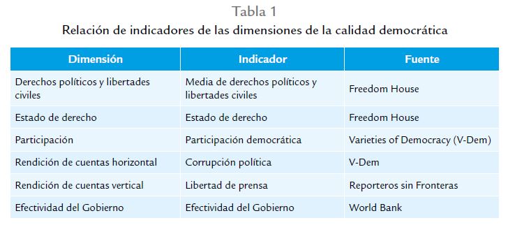 El siguiente paso es seleccionar un indicador cuantitativo para cada una de las seis dimensiones. Los indicadores se escogieron según la disponibilidad y continuidad en las bases de datos. Así, para la dimensión derechos políticos y libertades civiles, igual que otros estudios (Levine y Molina, 2007; Barreda, 2011; Valdebenito, 2022), se realizó un promedio de los indicadores de derechos políticos y libertades civiles de Freedom House que, para ambos, otorga una puntuación entre 1 y 7. En este trabajo se invierte la escala del promedio para facilitar la interpretación posterior. En la tabla 1 se resume la dimensión, el indicador y la fuente de la que provienen los datos.