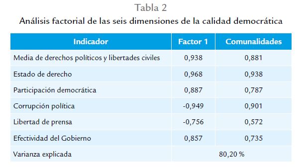 Así pues, el primer paso es elaborar un análisis factorial con seis dimensiones que componen la calidad de la democracia, como son derechos políticos y libertades, Estado de derecho, participación, rendición de cuentas (horizontal y vertical) y efectividad del Gobierno. Se parte de las explicaciones procedimentales de Dahl (1956), Mainwaring y Pérez-Liñán (2008) y Altman y Pérez-Liñán (2002) sin olvidar las dimensiones relativas al control del poder político que constan en los estudios de Diamond y Morlino (2004), Morlino (2007), Levine y Molina (2007, 2012) y Barreda (2011). Esta técnica de análisis factorial contribuye a comprobar la existencia de un factor subyacente (factor 1) entre las seis dimensiones que componen la calidad democrática. Con los resultados que arroja esta técnica estadística de reducción de datos se presenta un indicador agregado de calidad democrática de los países latinoamericanos y se procede a elaborar una clasificación de los diecisiete países estudiados según su calidad democrática.