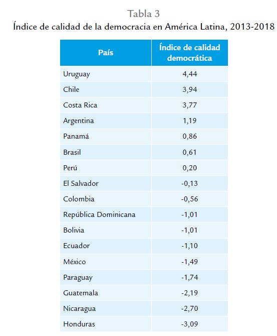 Los dos indicadores correspondientes al control del poder político (corrupción política y libertad de prensa) están muy asociados al factor subyacente de la calidad democrática, en especial, el indicador sobre la corrupción política. Esto indica que es necesario tener en cuenta las dimensiones relativas al control del poder político para abordar el estudio de la calidad democrática. Con los resultados se confecciona una media de la calidad de la democracia. Tal como se muestra en la tabla 3, existen diferencias en la puntuación entre países, así, los que obtienen una mejor puntuación, sobre 4,0 y 3,0 puntos, son Uruguay, Chile y Costa Rica, de cerca Argentina con 1,19. En cambio, hay diez países que tienen una puntuación negativa entre -0,1 y -3,0, ocupando Honduras, Nicaragua y Guatemala los últimos lugares en el período 2013-2018.