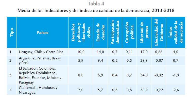 La tercera asociación (tipo 3) es la más numerosa, compuesto por 7 países, de color rojo en el dendrograma: El Salvador, Colombia, República Dominicana, Bolivia, Ecuador, México y Paraguay. Tienen un índice de calidad democrática inferior a los grupos anteriores, con la novedad de que su puntuación es negativa. Por último, el cuarto clúster de países (tipo 4) lo conforman Guatemala, Honduras y Nicaragua, con el color morado en el gráfico, que tienen peores puntuaciones en calidad democrática en la región (2 y -3), a diferencia del tercer grupo que, aunque también tiene puntuaciones negativas, su rango es de -0 y -1.
