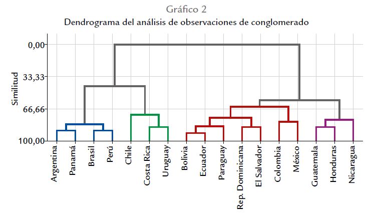 En la segunda parte del trabajo se realizó un análisis de conglomerado o clúster y un dendrograma en el cual se identificaron a cuatro grupos de países, según las características de las seis dimensiones de la calidad democrática. El primer grupo, formado por Uruguay, Chile y Costa Rica, obtuvo las mejores puntuaciones en los indicadores procedimentales de la democracia, en los indicadores sobre el control del poder político y en la efectividad del Gobierno. Tanto la segunda como la tercera agrupación obtuvieron puntuaciones más bajas en todos los indicadores de la calidad de la democracia que los países del primer grupo. El segundo grupo está compuesto por Argentina, Panamá, Brasil y Perú y los países del tercer grupo lo integran El Salvador, Colombia, República Dominicana, Bolivia, Ecuador, México y Paraguay. Por el contrario, Guatemala, Honduras y Nicaragua, del cuarto grupo, obtuvieron los resultados más bajos en calidad democrática y en los indicadores procedimentales de control del poder político y efectividad del Gobierno.