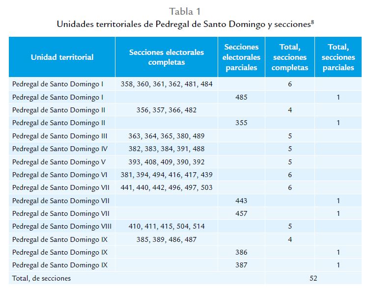 Coyoacán se integra de 403 secciones, las cuales se distribuyen para conformar los distritos federales electorales 23 y 24.6 En lo local integra los distritos XXVI,7 XXX y XXXII de los cuarenta distritos locales que conforman la geografía electoral de la capital. Santo Domingo tiene 52 de las 403 secciones de la alcaldía de Coyoacán que representa el 12,9%. Se integra por las unidades territoriales de Pedregal de Santo Domingo de la I a la IX, que comprende secciones completas y parciales tal como se muestra en la tabla 1. Esto convierte al barrio en un lugar central e importante para las elecciones en Coyoacán y en Ciudad de México, en tabla 1