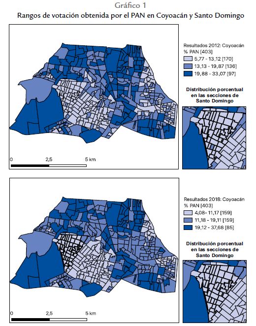 El gráfico 1 refleja las zonas de votación en las que el PAN obtuvo un mayor porcentaje de la votación en Coyoacán y Santo Domingo. En 2012, por ejemplo, ocuparon 97 secciones con un rango del 19,88 y 33,07 % (en azul oscuro); 136 secciones con el 13,13 y 19,57 % (en azul medio); y 170 secciones con el 5,77 al 13,12 % (azul claro). Para 2018, el PAN reafirma su aceptación en aquellas zonas que le dieron su apoyo en 2012, no obstante, aumentaron el rango de votación máxima obtenida, pero, disminuyeron el número de secciones de 97 a 85 con el 19,12 al 37,68 % (azul oscuro). Además, obtuvieron 159 secciones, con el 11,18 al 19,11 % (azul medio) y 159 secciones más con el 4,08 al 11,17 % (azul claro), en grafico 1.