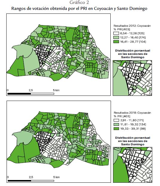 Estos resultados contrastan con los de Morena en 2018, partido con un promedio de votación de 36,90 % y una desviación estándar de 6,66, lo que muestra que, aun cuando ganan en Coyoacán, la preferencia no es homogénea. La tendencia se replica en el momento en que se estima el índice de fragmentación en las 52 secciones de Santo Domingo. Para 2012 el índice obtenía un valor de 0,429 y para 2018 incrementaba a 0,623, lo que refleja mayor competitividad. En relación con los partidos con mayor votación (sin coaliciones o candidaturas comunes), en promedio, el PRD obtuvo el 50,50 % de la preferencia para 2012, pero, en 2018 se redujo llegando al 23,84 %. Su desviación estándar reflejó variaciones mínimas entre una elección y otra, del 3,09 al 3,69. En comparación con el Morena, el promedio de votación fue de 43,65 % y su desviación estándar fue mayor que la del PRD con un 4,03.