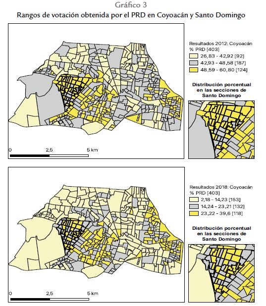 Para el PRD los resultados se identifican en los mapas del gráfico 3. Los porcentajes que obtuvieron fueron bastante alentadores para 2012 ya que, aun sin coalición, logró imponerse con un alto índice de votación. En 124 secciones logró una votación en un rango de 48,59 a un 60,80 % (amarillo oscuro), en 187 obtuvo entre el 42,93 y un 48,58 % (gris) y en 92 obtuvo un 26,83 a un 42,92 % (amarillo claro). Para los procesos electorales de 2018 sus porcentajes disminuyeron y solo lograron en 118 secciones del 23,22 al 39,60 % (amarillo oscuro), en 132 secciones del 14,24 al 23,21 % (gris) y, por último, en 153 un 2,18 a un 14,23 % (amarillo claro). Si bien, el PRD mantuvo algunas zonas con gran apoyo, desde 2012 empieza a ser evidente, en el polígono que corresponde a Santo Domingo, las zonas que dejaron de aportar altos porcentajes al PRD para dar paso al Morena, en gráfico 3