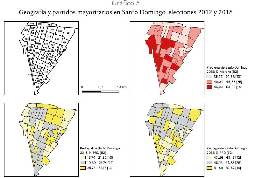 Esto nos permite comprender, en primer lugar, que la tradición de centro-izquierda que ha caracterizado a Santo Domingo se mantuvo en las dos elecciones, pero, las preferencias electorales partidistas cambiaron desde el PRD en 2012 a Morena en 2018. En segundo lugar, hay tensiones por el poder político porque el fundador del Morena, López Obrador, quien ganó las elecciones de 2018, había sido el candidato del PRD y había perdido las elecciones de 2012. La salida de López Obrador representa una fractura para el PRD en medio de la decisión de sus líderes, militantes y simpatizantes de continuar con dicho partido. Poner en perspectiva a ambos procesos electorales nos permite comprender la competitividad electoral, la fragmentación política, el voto urbano y el cambio partidista en Santo Domingo.
