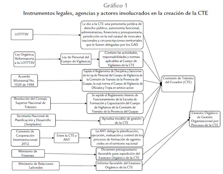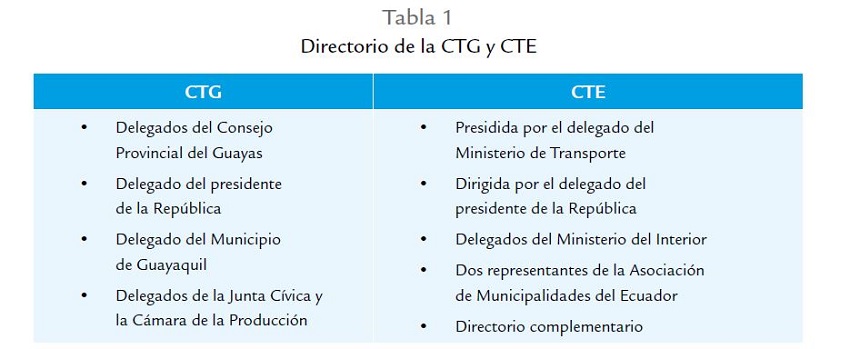 No obstante, la CTE tendría domicilio en Guayaquil y estaría precedida por un directorio conformado por un delegado del Ministerio de Transporte, del presidente de la República, del ministro del Interior y dos representantes de la Asociación de Municipalidades (AME) del Ecuador (Ibid., artículo 235). El gráfico 1 presenta un organigrama de los instrumentos legales, agencias y actores involucrados en la creación de la CTE: