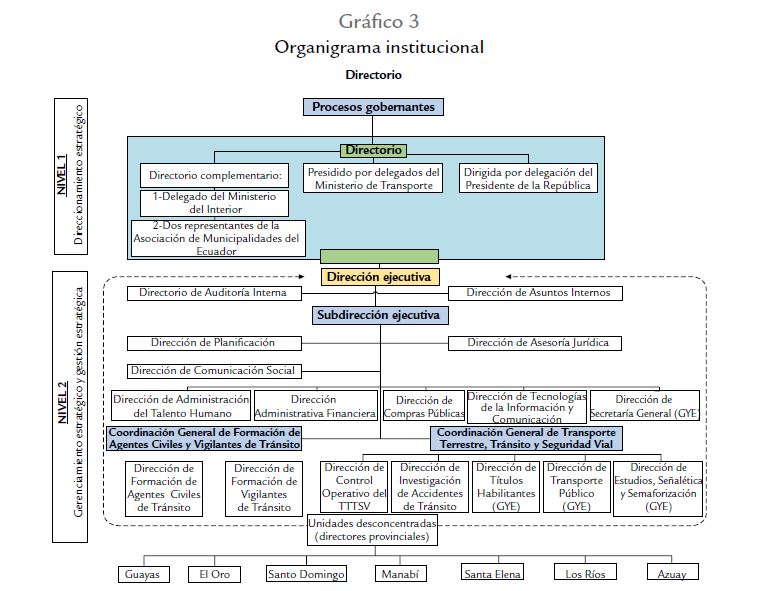 El nivel dos corresponde al gerenciamiento y gestión estratégica, liderado por un director ejecutivo y, por debajo de él, un subdirector ejecutivo. Las direcciones de Auditoría Interna y Asuntos Internos dependen del director, mientras que del subdirector dependen ocho direcciones administrativas, como Planificación, Comunicación Social, Talento Humano, Financiera, TIC, Compras Públicas, Secretaría General y Asesoría Jurídica. La Subdirección se encuentra a cargo de las coordinaciones generales de Formación de Agentes Civiles y Vigilantes de Tránsito, junto con la de Transporte Terrestre, Tránsito y Seguridad Vial. Las unidades desconcentradas de la CTE son Guayas, El Oro, Santo Domingo, Manabí, Santa Elena, Los Ríos y Azuay. En el siguiente organigrama se detallan los dos niveles organizacionales de la CTE. Sobre el tercer nivel se volverá más adelante: en el gráfico 3