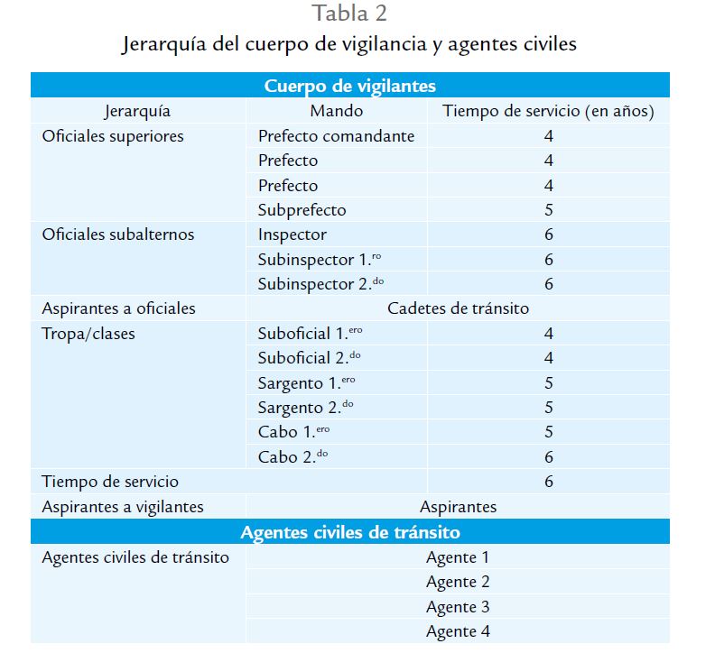 La jerarquía es uno de los elementos vinculados con la estructura burocrática. En la tabla 2 se aprecia la forma en la que la CTE está estructurada bajo una lógica militar de mando y tiempo, lo que refleja la idea weberiana respecto a una jerarquía organizacional, con flujo de órdenes. Esta jerarquía tiene asiento normativo en la LPVCTG, en la que también se establece la normativa de ascenso entre los diferentes rangos según los años de servicio. En los artículos 30 al 35 de dicha ley se pone de manifiesto que los cursos para ascensos a los nuevos grados son indispensables para comprobar la capacidad profesional del postulante. Un elemento weberiano surge en el momento en que un vigilante, al no completar el puntaje mínimo para ascender, será puesto en transitoriedad por incapacidad profesional. “La ocupación de un cargo es una “profesión”. Esto es obvio, primero, en la exigencia de un curso de preparación fijado de forma estricta, el cual reclama la plena capacidad de trabajo durante un largo período, y en las pruebas específicas, que son un requisito previo para el empleo (Weber, 2000, p. 10).