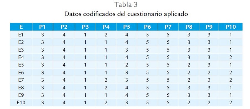 A continuación, se realiza una medición del mérito, salario y carrera en la CTE que, en conjunto, determinan el nivel de weberianidad, es decir, de la burocracia estatal. Esta medición parte de un cuestionario conformado por diez preguntas dirigidas a diez funcionarios de la CTE, del nivel directivo y unidades descentralizadas de la institución, vinculadas con los tres índices de Evans y Rauch. No todas las preguntas del cuestionario tenían el mismo número de opciones de respuesta: la pregunta 1 (que averiguaba por la formulación de política económica) tenía 3 opciones; las preguntas 2, 3, 4 y 5 (indagaba por la carrera) con 4 opciones; las preguntas 6, 7 y 8 (que preguntaban por el salario) tenían 5 opciones (a excepción de la pregunta 8, que tenía 4 opciones); las preguntas 9 y 10 (que investigaba sobre el mérito) con 3 opciones. La tabla que sigue a continuación contiene la opción marcada por cada encuestado (E) a cada una de las diez preguntas, así en tabla 3: