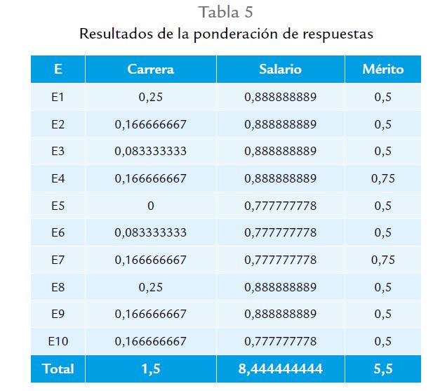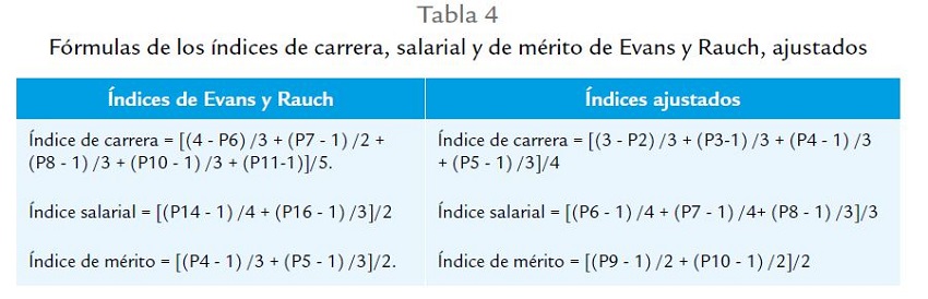 Con esta codificación se procedió a aplicar las fórmulas de los índices de carrera, salario y merito propuesta por Evans y Rauch, con la aclaración de que las fórmulas fueron ajustadas en función de los datos proporcionados por las encuestas y que constan en la tabla 4. El ajuste de las fórmulas se debe a que la encuesta original de Evans y Rauch tiene más de dieciséis preguntas, con las que los autores construyeron el índice de weberianidad. La ponderación o peso que les da a cada una está relacionada con su rendimiento burocrático y el crecimiento económico, de este modo, para ellos el mérito es un principal índice. En el caso del presente estudio, solo se usaron diez preguntas y se ajustaron al modelo de estudio; a la vez, se centró más en el índice de salario, tomando en consideración elementos como el clientelismo político y la corrupción. De la aplicación de las fórmulas en formato de Excel se extrajeron los resultados de la tabla 5.