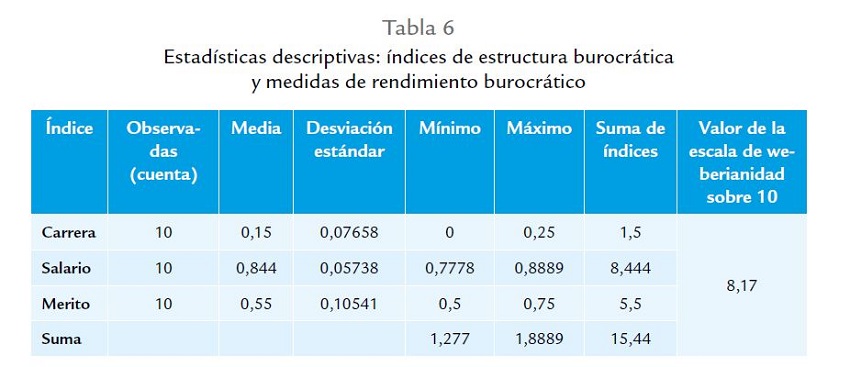 Por último, se sumaron los tres valores anteriores (0,7940+4,47032+2,91159=8,1759. El resultado alcanzado (8,17) representa el grado de weberianidad de la CTE. Las estadísticas descriptivas de los 3 índices están señaladas en la tabla 6 que sigue.