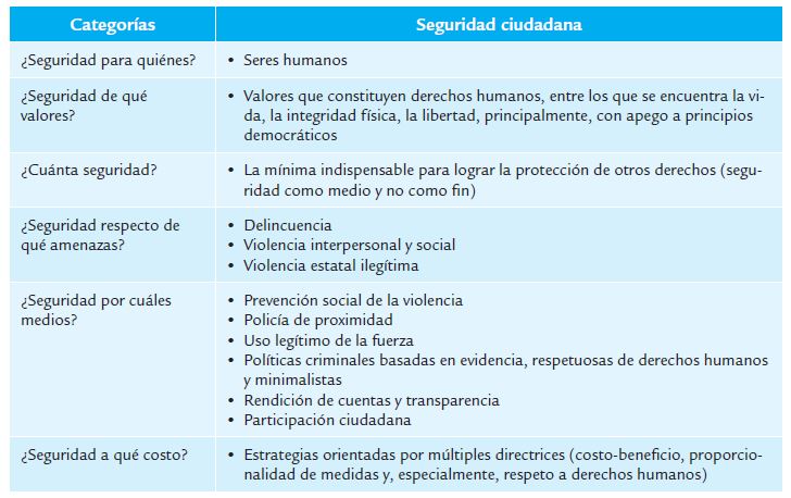 Dicha transmutación es producto, por una parte, de reconocer que la seguridad se construye colaborativamente por las personas, bajo principios democráticos y respetuosos de los derechos de las personas y no solo desde el Estado y sus instituciones, con arreglo a las estrategias policiales y penales represivas. Por otra parte, tal transformación se relaciona con la identificación de varios factores necesarios para lograr dignidad y armonía en los proyectos de vida de la ciudadanía, circunstancias aquellas que se entienden adicionales a la simple ausencia de riesgos en materia de seguridad doméstica. La tabla 1 contiene las características específicas de la seguridad ciudadana, según las categorías de análisis de Baldwin (1997).