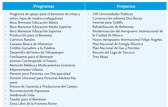 También consta el Programa Zona Libre de la Frontera Norte, que prevé reducciones fiscales en el impuesto al consumo (IVA) y al ingreso (ISR) en 43 municipios de los estados de Baja California, Sonora, Chihuahua, Coahuila, Nuevo León y Tamaulipas, frontera con Estados Unidos. Por último, el plan contempla la construcción del Aeropuerto Internacional “Felipe Ángeles” en el estado de México, la rehabilitación de las refinerías, así como la construcción de otra en el puerto Dos Bocas, estado de Tabasco. Los programas y proyectos del Gobierno actual constan en la tabla 1: