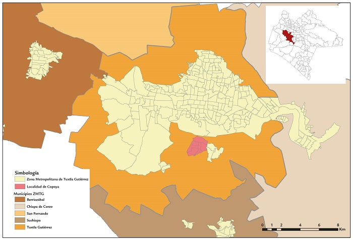 Copoya es una localidad urbana que se encuentra ubicada al suroriente de la ZMTG, en el estado de Chiapas. Está rodeada al norte por la meseta de Copoya y el valle, en un relieve claramente escarpado, caracterizado por pendientes (Paz et al., 2012), con dos reservas forestales importantes para el área metropolitana: el cerro Mactumactzá y la reserva El Zapotal. Se caracteriza por su riqueza ambiental e identidad cultural, histórica y gastronómica: sus pobladores son herederos de indígenas zoque que fueron despojados de sus tierras por las cofradías del siglo XVIII y cuyo ganado permitió financiar la lucha independentista del XIX (Sánchez-Cortes y Lazos, 2009). Por ende, se trata de una población históricamente vulnerada y rezagada cuya lucha por el acceso a la tierra se convirtió en su bandera. En 1922, al amparo de la reforma agraria posrevolucionaria, sus pobladores agricultores y jornaleros fueron incluidos en el reparto de 396 hectáreas de tierra que se ampliaron a 800 en 1924, a 2277 en 1939 y 232,5 en 1987 (Ibid.).