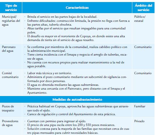En Copoya cohabitan dos servicios para la provisión de agua: el municipal y el comunitario, que se complementan con las medidas de autoabastecimiento de los lugareños: los pozos de traspatio y la compra de pipas a proveedores privados. Los dos servicios son insuficientes, en primer lugar, porque los nuevos asentamientos se ubican en el nororiente de la localidad, que es una zona de gran especulación y demanda de tierra, pero, al mismo tiempo, la que menos infraestructura de agua potable tiene y la que mayor impacto ambiental atraviesa debido a su cercanía con el cerro de Mactumactzá. Por eso, “[…] se debe estimular una planeación urbana acorde con el crecimiento natural e inducido de los habitantes con base en el suministro de los servicios e infraestruc tura” (Soto-Cortés, 2015, p. 138) que en Copoya ocurre al contrario: primero se construye y luego surge el interés por la edificación de la infraestructura pública para el acceso al agua.