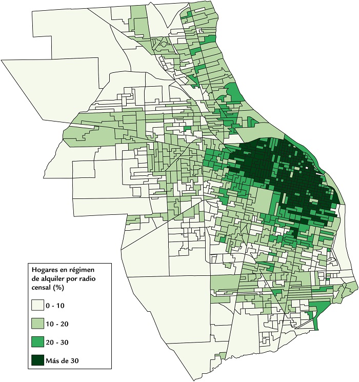 Es posible conocer el perfil demográfico y socioeconómico del mercado de alquiler, el cual comprende, en su mayoría, a sectores de clase media, con educación universitaria (completa, casi completa o secundaria completa) y alta actividad laboral, con el 82 %. Dentro de la población inquilina inactiva, el 46,2 % corresponde a jubilados y 42,3 % a estudiantes (Reese, 2013). El alquiler de una vivienda céntrica les proporciona flexibilidad en temas de movilidad y cercanía a bienes y servicios. Estos sectores, en conjunto, pueden costear los precios y cumplir con las garantías solicitadas por el arrendador. Así, se expulsan a los sectores de menos ingresos al mercado informal en ubicaciones periféricas, sin buen acceso a servicios públicos o mediante la tenencia irregular en asentamientos o viviendas en muy mal estado.