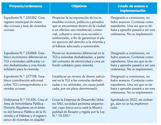 El Consejo Municipal de Rosario se ha propuesto actuar sobre dos ámbitos: por un lado, la vivienda ociosa (problemática para la cual se han presentado distintas iniciativas) y, por el otro, la creación de una inmobiliaria pública desde la que se busca impactar en el mercado de alquileres. En cuanto a la vivienda ociosa, en 2020 se presentaron tres proyectos de ordenanza que comprenden la creación del registro municipal de viviendas ociosas y una tasa especial para estas viviendas (presentada por el concejal Eduardo Toniolli), el incremento diferencial en la Tasa General de Inmuebles (TGI) a viviendas calificadas como deshabitadas y la creación de un Fondo Solidario para la Vivienda (presentada por María Eugenia Schmuck), además de la contribución adicional sobre TGI correspondiente a viviendas ociosas (liderada por Fernanda Gigliani).