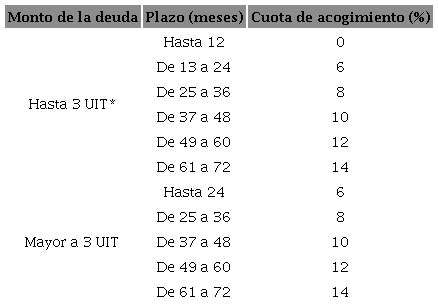 La cuota de acogimiento se determina de acuerdo con el monto y plazo de la deuda tributaria que se solicita fraccionar o aplazar y fraccionar, no puede ser menor al 5 % de la unidad impositiva tributaria (UIT), y debe cancelarse a la fecha de presentación de la solicitud de fraccionamiento, o hasta la fecha de vencimiento de pago de los intereses del aplazamiento tratándose de solicitudes de aplazamiento y fraccionamiento (tabla 1).