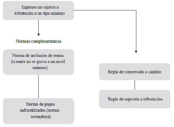 La Regla de sujeción a tributación (Subject to Tax Rule - STTR) complementa las anteriores; se enfoca en los riesgos para los países de origen que plantean las estructuras BEPS, relacionados con los pagos intragrupo que toman ventaja de las bajas tasas nominales de impuestos en la jurisdicción del beneficiario contratante (OCDE, 2019b). Asimismo, la regla de conversión (sor, por sus siglas en inglés) funciona como una norma complementaria al eliminar los obstáculos de los tratados para su aplicación cuando un tratado obliga a un Estado contratante a utilizar el método de exención.