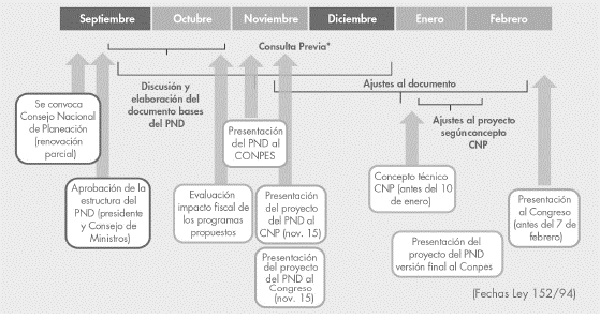 El PND tiene un proceso de presentación, elaboración y trámite legislativo. El Gobierno nacional es el encargado de presentar el PND conforme a lo que establece el artículo 200 de la CP: "Le corresponde al Gobierno, en relación con el Congreso: presentar el Plan nacional de desarrollo y de inversiones públicas, conforme a lo dispuesto en el artículo 150" (Constitución Política de Colombia, 1991).