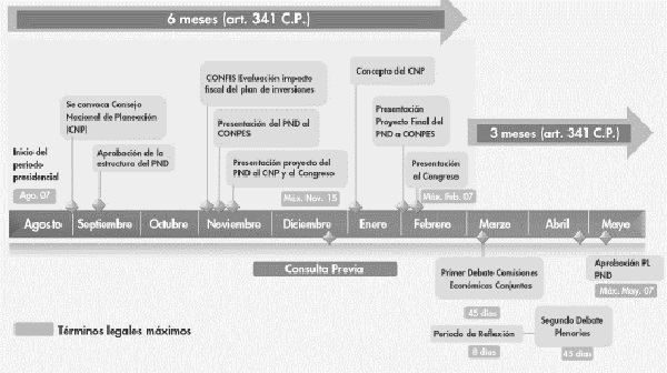 En consecuencia, si se observa lo anterior de manera gráfica, el resultado temporal de un PND, desde su elaboración hasta su aprobación es el siguiente (figura 2):
