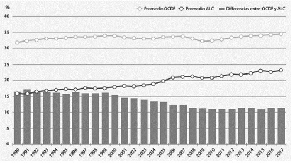 En temas de recaudación tributaria también existen notables diferencias con los países miembros de la OCDE, ya que estos presentan porcentualmente mayores índices de recaudación frente a los países de América Latina; se puede suponer que esta brecha se da por fenómenos como la corrupción y la evasión tributaria que tanto aquejan a los países latinoamericanos y del Caribe. A continuación, en la figura se muestra la proporción de esta presión tributaria y sus diferencias.