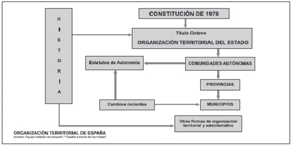 La Constitución de 1978, en su Capítulo Octavo, determina la organización territorial de España estableciendo las Comunidades Autónomas, que tendrán sus propios Estatutos de Autonomía, las provincias y los municipios. La Constitución prohíbe la federación de Comunidades Autónomas, pero permite otras formas de organización territorial y administrativa como la comarca, mancomunidad, cabildo, etc. El mapa actual de España refleja, por un lado, la influencia de la Historia y, por otro, introduce cambios derivados de las nuevas situaciones socioeconómicas. (Instituto Geográfico Nacional de España, 2020)
