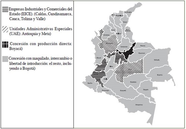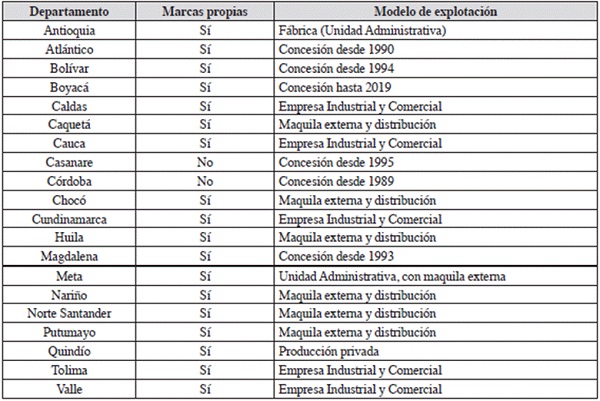 En la tabla 1 se presentan resumidamente las modalidades adoptadas en 20 departamentos con marcas de licores y fábricas, donde se describe el estado actual de cada jurisdicción; los entes territoriales (departamento) que no son relacionados no cumplen con dichos preceptos.