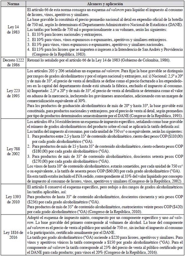 Durante las últimas décadas se han adoptado y establecido en Colombia diferentes esquemas tributarios respecto al IDC de licores, vinos, aperitivos y similares, lo que ha generado impactos en los diferentes departamentos. El impuesto ha variado entre un componente ad valorem y otro específico por grados de alcohol, hasta llegar al actual esquema mixto que agrupa los dos componentes conforme a los preceptos de la Ley 1816 de 2016 denominada la nueva ley de licores (NLL).