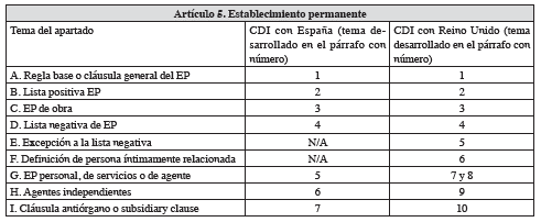 En relación con los CDI suscritos con España (2006) y Reino Unido (2018), la cláusula 5° desarrolla el establecimiento permanente bajo las líneas trazadas en el MCOCDE vigente en su momento. Ya con posterioridad al informe BEPS, realizado en el 2015, se identifican sustanciales modificaciones al artículo 5.°, por ejemplo, se incluyó el concepto de "empresa íntimamente relacionada" y el de "persona estrechamente vinculada a una empresa".