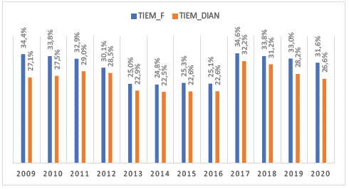 Las cifras utilizadas para calcular el TIEM-F provienen de los datos agregados de las declaraciones tributarias de las personas jurídicas publicados por la DIAN (2021b). El valor del impuesto neto de renta se tomó directamente de la base de datos construida a partir de dichos datos, mientras que la renta líquida gravable se estimó de la siguiente manera: i) elegir la cifra mayor entre la renta líquida y la renta presuntiva, ii) adicionar las rentas gravables y iii) restar las rentas exentas. La información corresponde a los años comprendidos entre 2009 y 2020, esto con el fin de abarcar periodos previos y posteriores a la vigencia de las leyes 1607 de 2012 y 1819 de 2016.