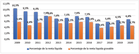 En la figura 2, se puede observar que, entre 2009 y 2011, se da la mayor proporción de ren tas exentas respecto de la renta líquida y que esta participación se mantiene a la baja hasta el año gravable 2013. En relación con la renta líquida gravable, la proporción es mucho menor, para esos mismos años, esto indica que, durante este periodo, muchas empresas tributaron en Colombia sobre su renta presuntiva. En cuanto al periodo de 2013 a 2016, se observa que la participación de las rentas exentas en la renta líquida se mantiene entre el 7 % y el 7.9 %, mientras que la proporción de las rentas exentas frente a la renta líquida gravable estuvo entre el 5.5 % y el 5.9 %, mostrando un acercamiento entre la renta líquida y la renta líquida gravable para ese periodo. Los años gravables de 2017 a 2020 son los que presentan menor impacto de las rentas exentas frente a la renta líquida y a la renta líquida gravable donde no superan 7 % y el 5 %, respectivamente.
