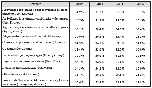 En las tablas 1, 2 y 3, se muestra el TIEM_F promedio por sectores de actividad para los doce años objeto de análisis y se encontró que, en el 2012, hubo una disminución genera lizada de la presión fiscal en todos los sectores, derivado de un mayor aprovechamiento de las rentas exentas como lo plantean Yori et ál. (2012, 2014) y con un impacto marcado en el sector de las "actividades deportivas y otras actividades de esparcimiento".