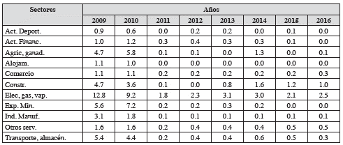 Dado que en la base de datos se encontró que esta deducción especial tuvo un efecto importante, únicamente hasta el año gravable 2016, se presenta su análisis en relación con los años de 2009 a 2016, mostrando su representatividad en relación con las deducciones totales. Para ello se ha calculado, en primer término, la deducción por inversión en activos fijos como porcentaje del importe total de las deducciones (tabla 9). En segundo lugar, (tabla 10) se realiza el mismo cálculo por sectores de actividad y por año.