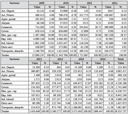 Estas cifras deben observarse considerando al mismo tiempo que la cantidad de empresas presentes en cada sector de actividad económica es muy variable. Aunque la información agregada de la DIAN no indica el número de empresas que integran cada uno de los sectores, sí se tomó como referente la distribución de la base de datos construida por Heredia (2016), a partir de los datos publicados por la Superintendencia de Sociedades entre 2008 y 2012. Es posible que los tres sectores con mayor aprovechamiento de la deducción por inversión en activos fijos agrupen menos del 7 % del total de las empresas contribuyentes del ISR. Esto contrasta con sectores como "comercio" e "industrias manufactureras", que agrupaban 32.1 % y el 19.2 % del total de las empresas en la citada base de datos.