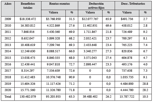 En cuanto a los beneficios tributarios, se puede afirmar que tras la reforma tributaria de 2018 se generó un incremento en el valor de los descuentos tributarios para 2019 y 2020. Adicionalmente, las rentas exentas que durante el 2019 mostraron un descenso, recuperan sus valores habituales durante el 2020, esto, a pesar de la crisis económica generada por la covid-19, lo que conduce a pensar que, de haber tenido un año económicamente estable, el valor de las rentas exentas pudo ser todavía mayor al registrado