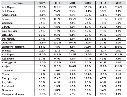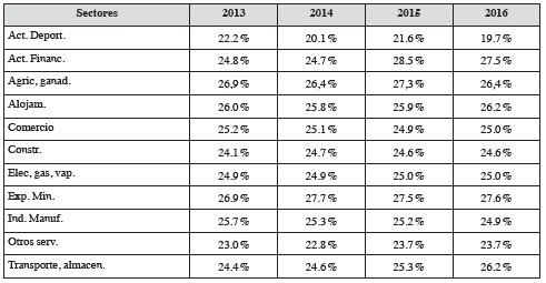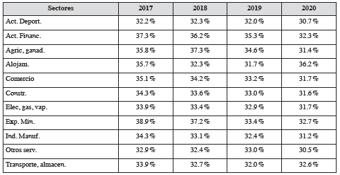 Durante el periodo 2013-2016, solo tres de los sectores analizados tuvieron una tasa efectiva inferior a la tasa nominal. El sector que registró el menor TIEM_F durante estos años fue "Act. Deport.", seguido por "Otros serv." Y "Constr.", mientras que los sectores con mayor presión fiscal fueron "Exp. Min.", "Act. Financ.", "Agric, ganad." y "Alojam." Estos sectores, se mantienen con los TIEM_F más elevados también para el periodo 2017 2020, aunque el orden varía ligeramente, pasando al primer lugar el sector de las "Act. Financ." Durante el 2017, además del incremento en la tasa nominal del impuesto, que se situó en el 34 %, se presentó una disminución en el aprovechamiento de las rentas exentas y de la deducción por inversión en activos fijos.