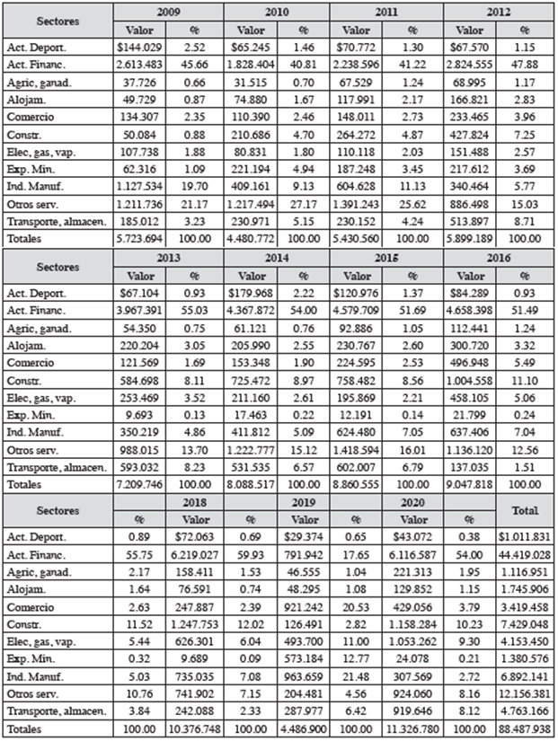 Otros sectores que lograron aminorar su carga impositiva vía beneficios tributarios fueron: "actividades financieras inmobiliarias y de seguros", especialmente, gracias a las rentas exentas, aunque las empresas de este sector también aprovecharon los descuentos tributarios y la deducción por inversión en activos fijos. Otros sectores que lograron aminorar su carga tributaria al hacer uso de los beneficios tributarios mencionados fueron: "explotación de minas y canteras", "industrias manufactureras", "construcción" y "servicio de transporte, almacenamiento y comunicaciones".