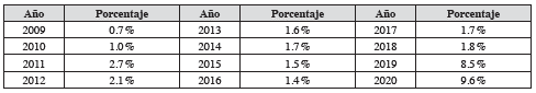 Es importante anotar que, durante el periodo de observación, comprendido entre 2009 y 2020, la tarifa general del ISR para personas jurídicas fue del 33 % durante los años 2009 a 2012, 2018 y 2019; del 34 % para el 2017 y del 32 % para el 2020. Esta es una muestra clara de que en el país no hay una política tributaria de largo plazo y que, de manera permanente, se ajustan los tipos legales del ISR, pudiendo generarse también una variación en las tasas efectivas. No obstante, se esperaría que en la línea de lo expresado por the Government Accountability Office (2008) existan diferencias significativas entre el tipo impositivo legal y el TIE a causa de las exenciones, los diferimientos y demás incentivos fiscales presentes en la normativa.