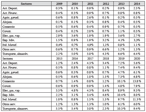 También se analizó el comportamiento de los descuentos tributarios por sector respecto del total de descuentos tributarios anuales (tabla 8) y se encontró que, de manera consistente, los sectores "explotación de minas y canteras" y "electricidad, gas, vapor y agua" fueron los que más aprovecharon este beneficio tributario, mientras que los sectores de "actividades deportivas y otras actividades de esparcimiento" y de "alojamiento y servicios de comida" fueron los que menos los disfrutaron.